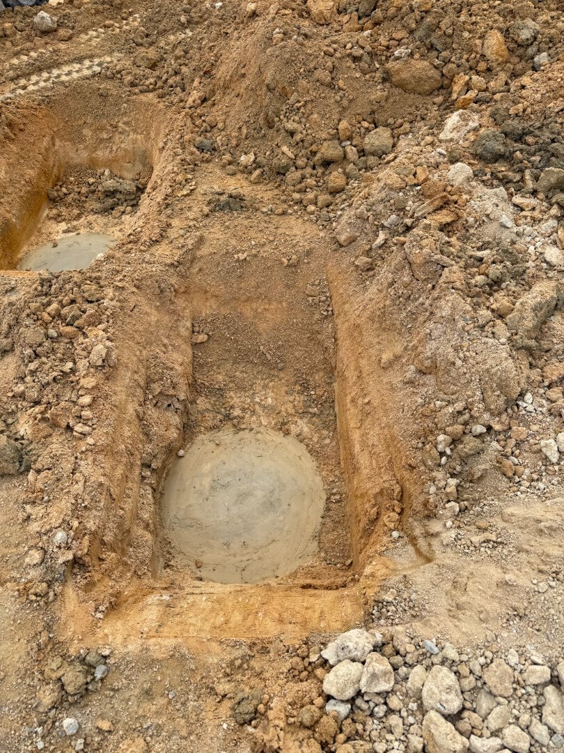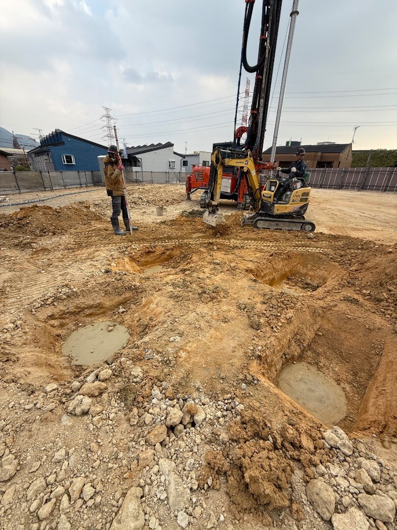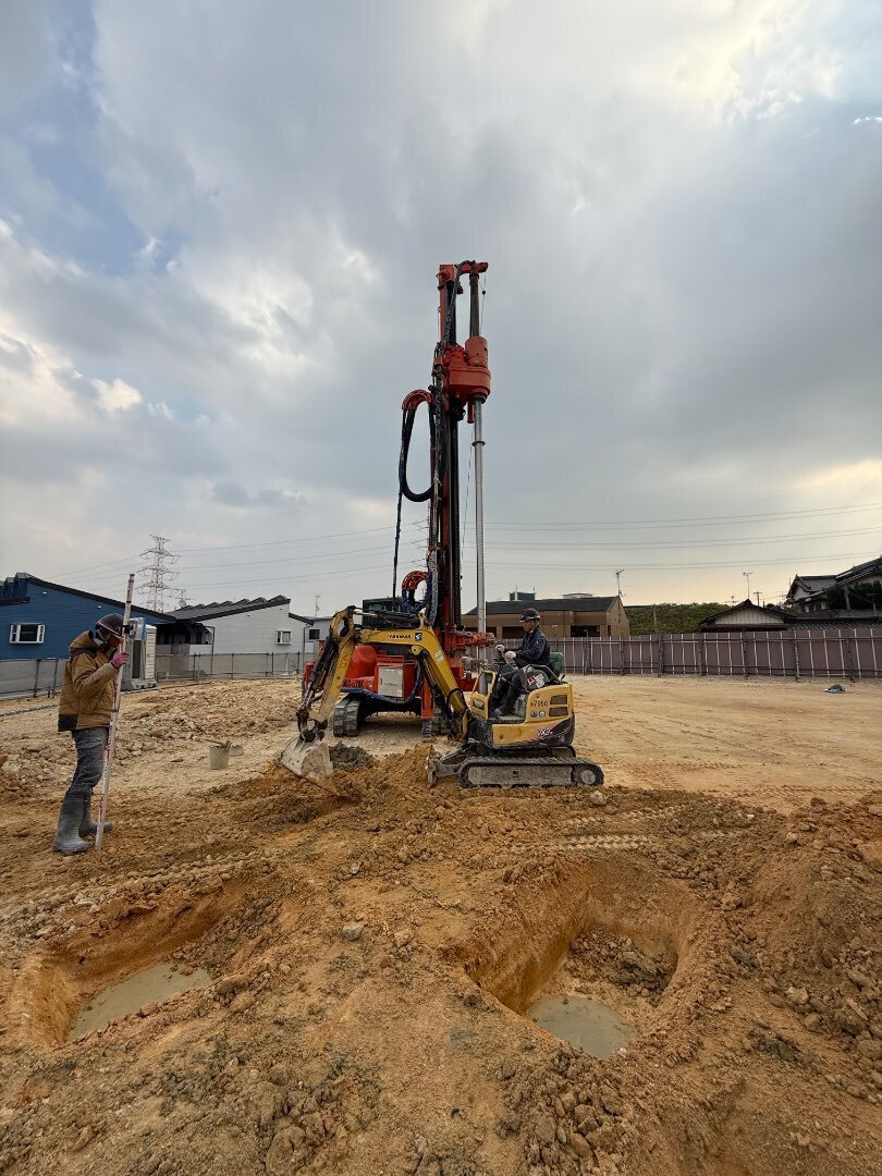 木造の建物が後々傾いたりしないように、杭を地面に打って建物を支える工事です。