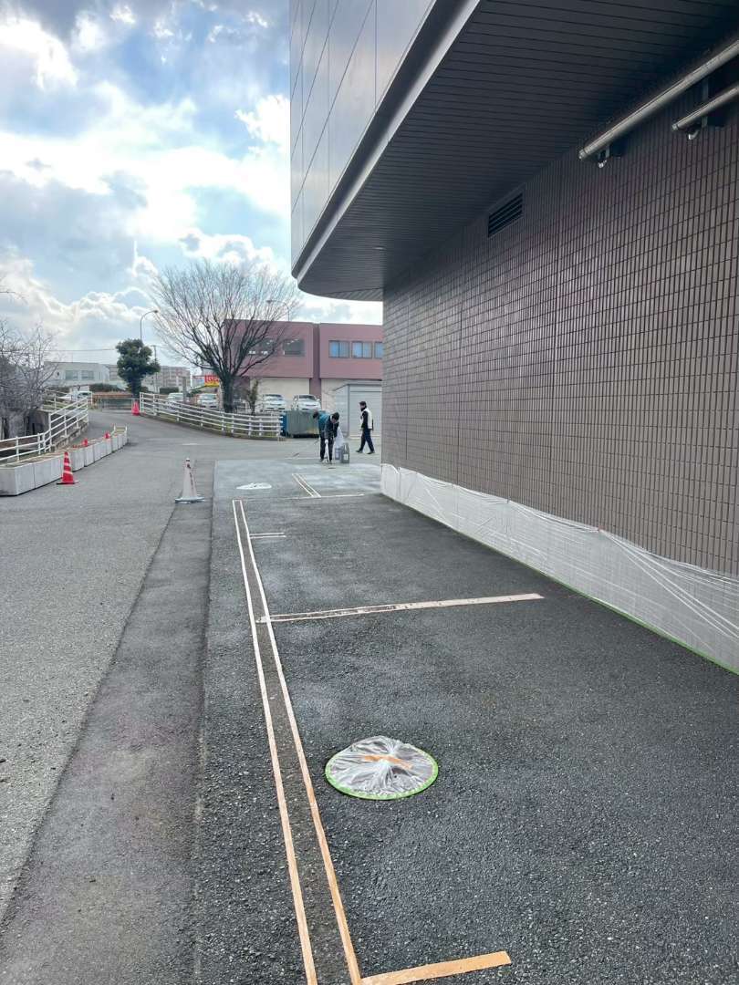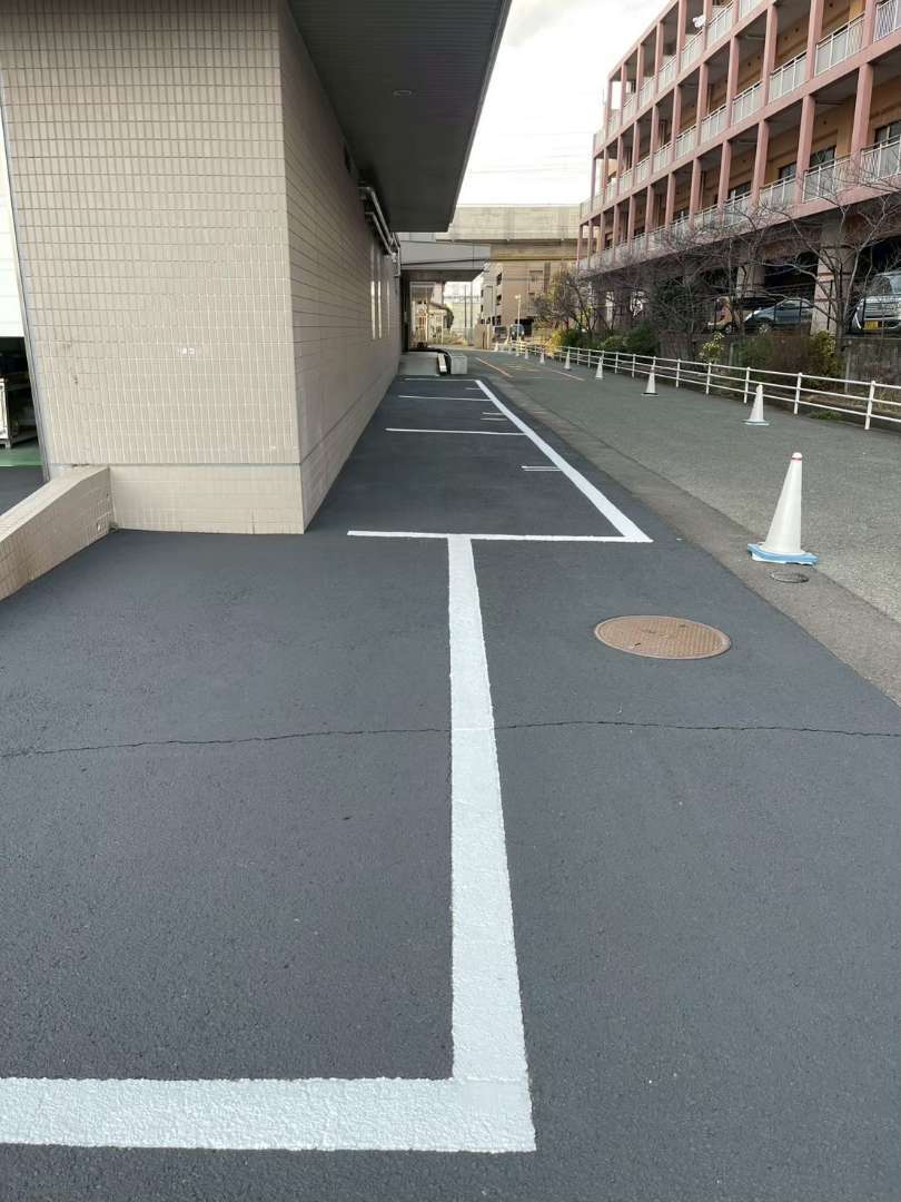 兵庫県神戸市にて、建物周囲の駐車場へライン引き塗装工事を実施しました。既存のラインが経年劣化により薄れていたため、視認性と安全性を向上させることを目的に、再塗装を実施。